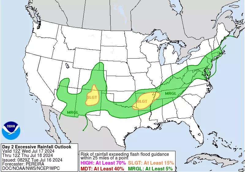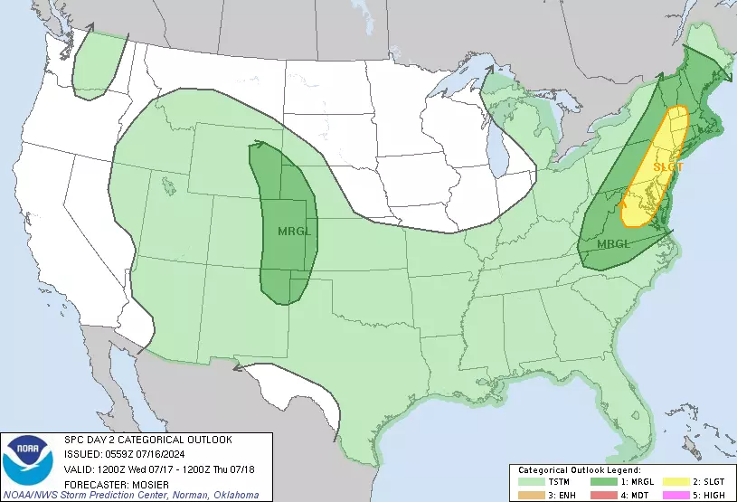 There is a chance of a thunderstorm after about 5 p.m. Tuesday, centered on the evening hours. I am not convinced this complex of rain will make it through New Jersey before it completely falls apart. But just in case, it is worth mentioning. Especially since if a storm does arrive, it could be on the strong side with a quick downpour, wicked lightning, and gusty winds. The Storm Prediction has even pegged New Jersey with a "Slight Risk" (level 2 of 5) on Tuesday's severe weather outlook.
